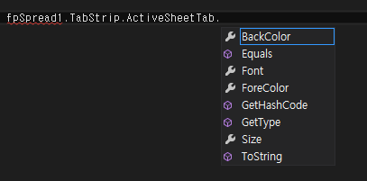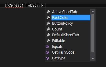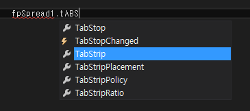 그럼 fpSpread1을 적고 . 을 찍어 TabStrip이 있는지 확인해보자
