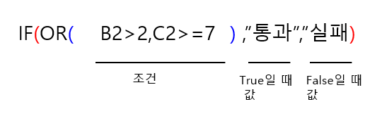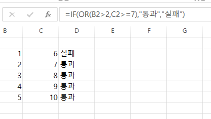 =IF(OR(B2>2,C2>=7),"통과","실패")